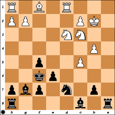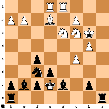 21 Nf4?? (natürlich musste 21 Nb2 geschehen, um das Feld a4 zu überdecken)