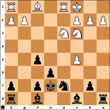 8 f3 exf3 9 0-0-0+ Nd7 10 Nxf3 e6 11 Ne5 Ke7 (natürlich nicht 11...Ke8?? 12 Bb5+-) 12 Nd3